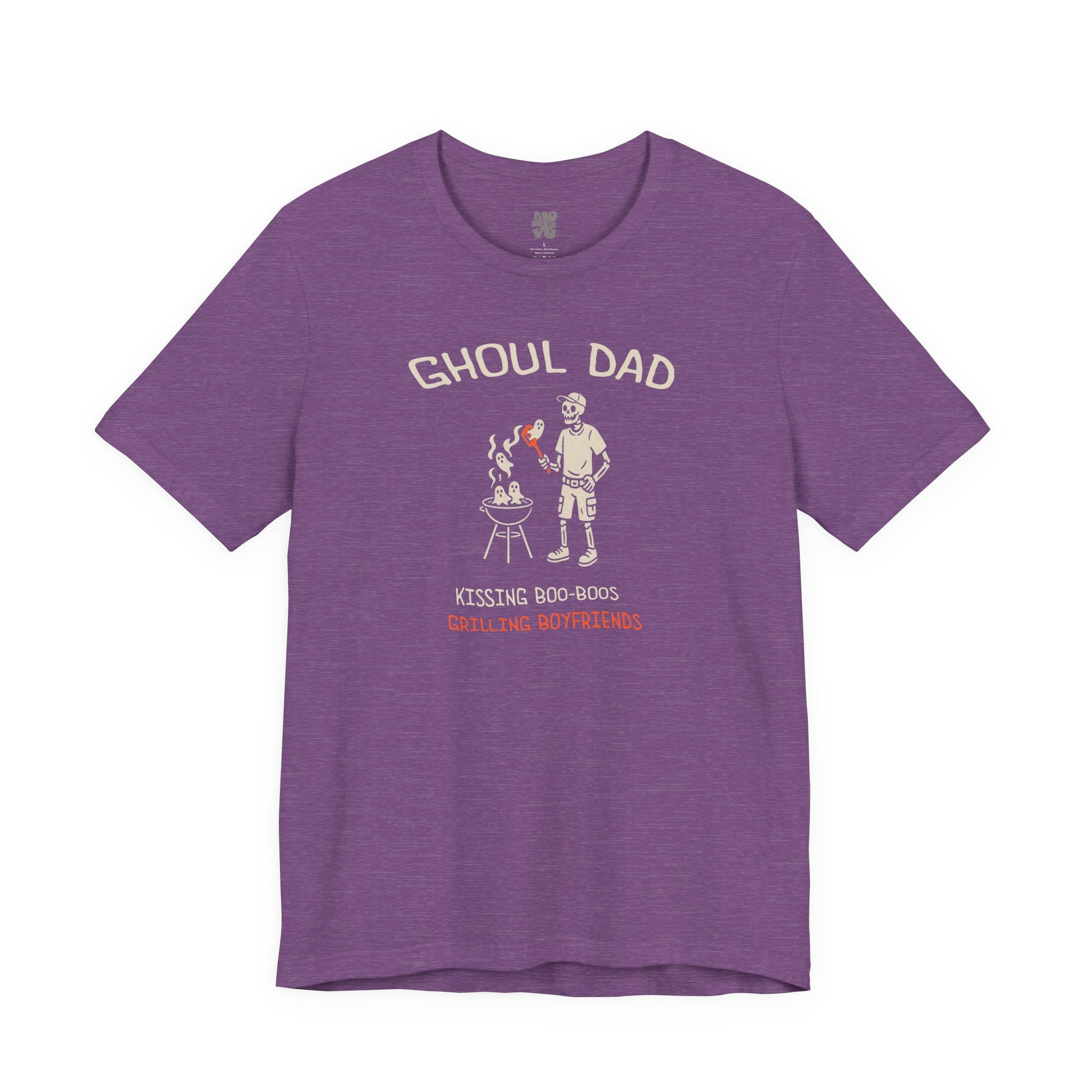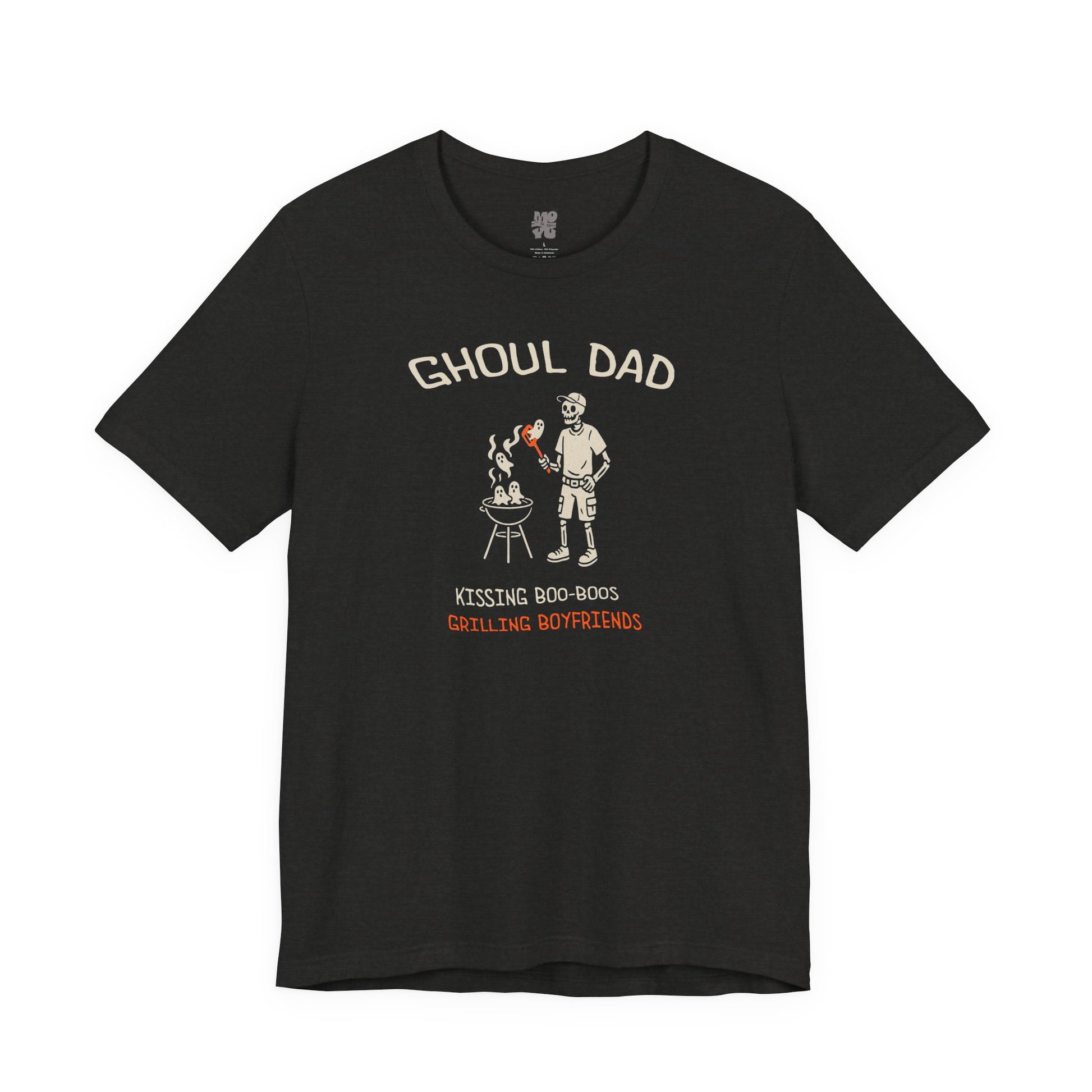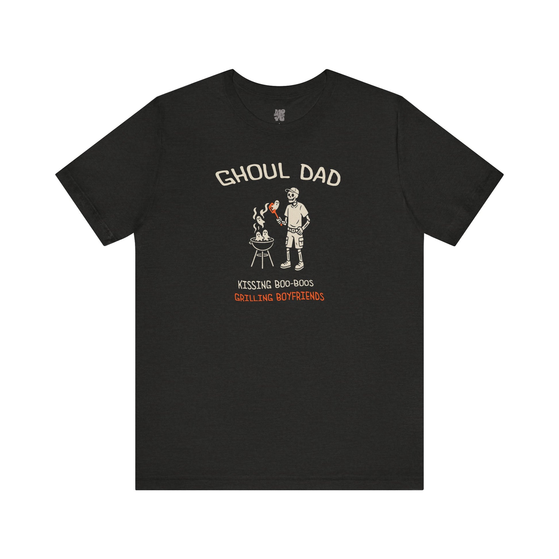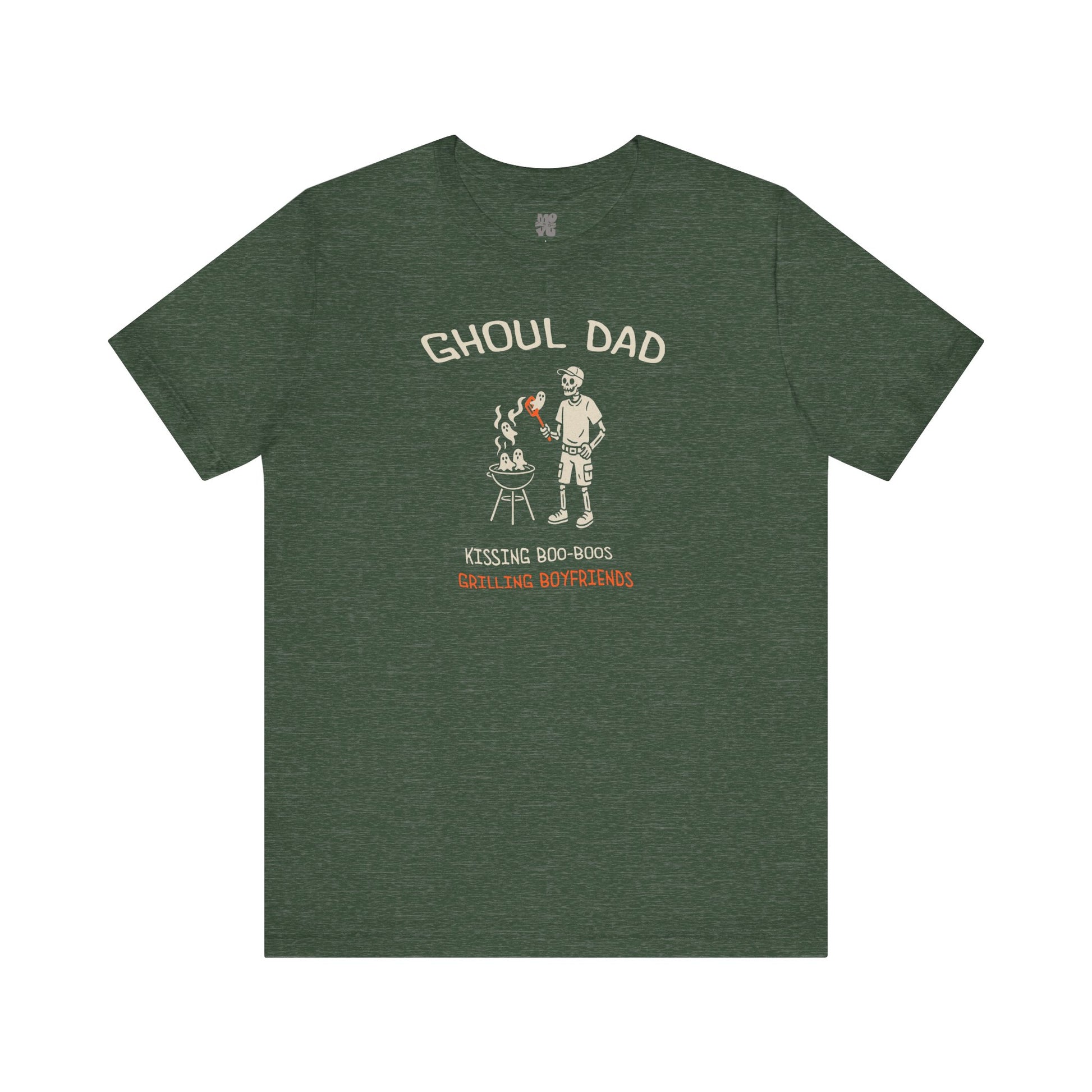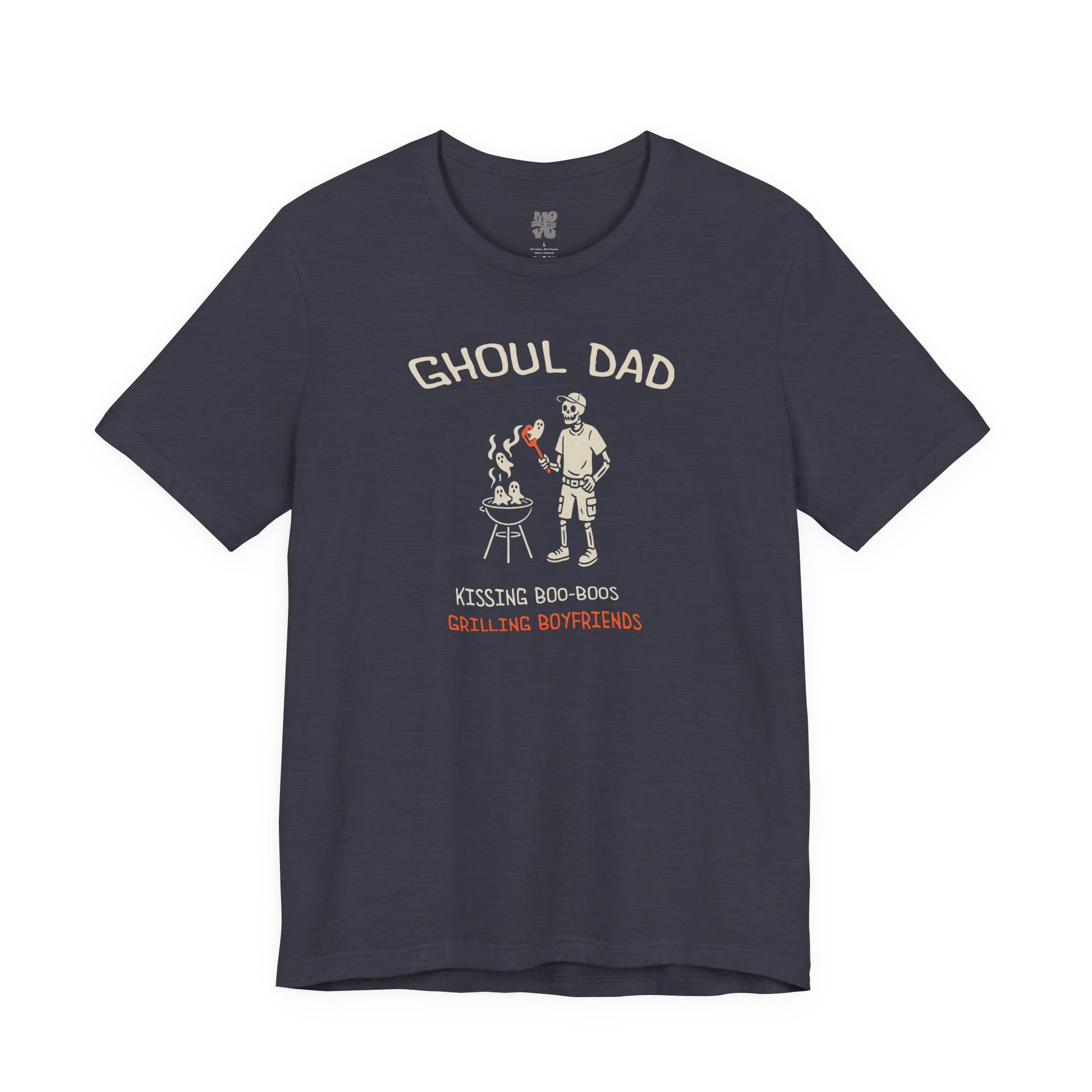 Celebrate spooky season dad-style with this brilliant father of daughters Halloween shirt  showcasing a laid-back skeleton manning the grill, dressed in his classic tee and cargo shorts. The skeleton grilling graphic captures the perfect "Ghoul Dad" parenting energy as he flips little boyfriend ghosts on his spatula, embodying that signature protective dad energy we all know and love. Perfect gift for dads of girls, skeleton enthusiasts, and anyone who loves dad humor clothing. This design will also appeal to those needing a hilarious low fuss costume, Trick-or-Treating or seasonal shirt. Upgrade the family Halloween experience by pairing with our "Monster Mama" Tee for mothers. Printed on super soft cotton with ribbed collars, tapered shoulders, and dual side seams, these premium T-shirts are designed for better fit, drape, and  shape retention.
